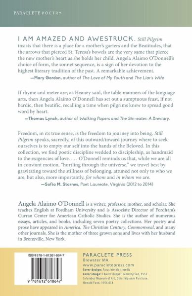 "If rhyme and meter are, as Heaney said, the table manners of the language arts, then Angela Alaimo O'Donnell has set out a sumptuous feast, if not bardic, then beatific, recalling a time when pilgrims knew to spread good word by heart." -Thomas Lynch, author of Walking Papers and The Sin-eater: A Breviary Still Pilgrim is a collection of poems that chronicles the universal journey of life as seen through the eyes of a keenly-observant friend and fellow traveler. The reader accompanies the Still Pilgrim as she navigates the experiences that constitute her private history yet also serve to remind us of our own moments of enlightenment, epiphany, and encounter with mystery. Each of the 58 poems of the collection marks a way station along the pilgrimage, a kind of holy well where the Pilgrim and reader might stop and draw knowledge, solace, joy, and the strength to continue along the path. At the center of this spiritual travel book lies a paradox: the Pilgrim's desire for the gift of stillness amid the flux and flow of time, change, and circumstance. "Be still and know that I am God," sings the Psalmist, channeling the voice of the divine. "Teach us to care and not care. Teach us to sit still," prays the poet, T.S. Eliot. Still Pilgrim depicts and embodies this human dilemma--our inevitable movement through time, moment by moment, day by day, and the power of art to stop both time and our forward march, to capture the present moment so we might savor the flavor of life. "The Still Pilgrim's history consists of flashes of joy and visitations of sorrow, engagement with saints and with artists (the Pilgrim's personal patron saints), epiphanies sparked by words and songs and stories, revelations triggered by encounters with beauty and terror. The gentle reader who perseveres through these poems is no longer merely a reader--he or she is a partner in pilgrimage and a friend. These poems have become your poems, this story your story, bespeaking our (un)common beginnings and our equally (un)common end." -Angela Alaimo O'Donnell, from the Afterword