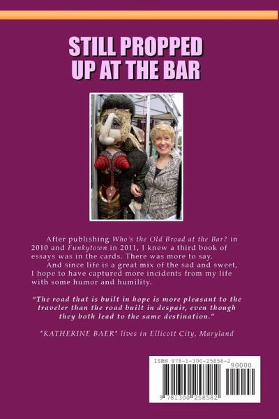 After publishing Who's the Old Broad at the Bar? in 2010 and Funkytown in 2011, I knew a third book of essays was in the cards. There was more to say. And since life is a great mix of the sad and sweet, I hope to have captured more incidents from my life with some humor and humility. "The road that is built in hope is more pleasant to the traveler than the road built in despair, even though they both lead to the same destination."