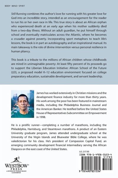 Still Running combines the author's love for running with his greater love for God into an incredible story, intended as an encouragement for the reader to run his or her own race in life. This true story is about an African orphan who experienced death at an early age when his mother suddenly died from a two-day illness. Without an adult guardian, he put himself through school and eventually matriculates across the Atlantic, where he becomes a crusader against poverty. Incorporating sport metaphors to teach life's lessons, the book is in part an autobiography and an inspirational manual. Its main takeaway is the role of divine intervention versus personal resilience in human pliancy. This book is a tribute to the millions of African children whose childhoods are mired in unimaginable poverty: At least fifty percent of its proceeds go to support the Liberian Education Initiative: African School of the Future (LEI), a proposed model K--12 education environment focused on college preparatory education, sustainable development, and servant leadership.