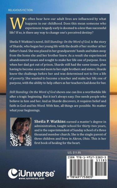We often hear how our adult lives are influenced by what happens in our childhood. Does this mean someone who experiences tragedy early is doomed to a less than successful life? If so, is there any way to change one's perceived destiny? Sheila P. Watkins's novel, Still Standing: On the Word of God, is the story of Sharde, who began her young life with the death of her mother at her father's hand. She was placed in her grandparents' hands and taken away from the home she and her brother knew. As a result she experienced abandonment issues and sought to make her life one of purpose. Even when her dad got out of prison, Sharde still had the same issues, plus having to become a second mom to her eight brothers and sisters. Sharde knew the challenge before her and was determined not to live a life of poverty. She wanted to become a teacher and make her life one of purpose, with the ability to help others as her teachers had done for her. Still Standing: On the Word of God shows one can live a worthwhile life after a tragic beginning. But it isn't always easy. One needs people who believe in him and her. And as Sharde discovers, it requires belief and faith in God and his Word. With him, all things are possible. No matter what your beginnings.