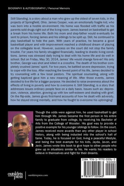 Still Standing, is a story about a man who grew up the oldest of seven kids, in the projects of Springfield, Ohio. James Cooper, was an emotionally fragile kid, who was born into a hostile environment. His home was flooded with traffic as his parents sold drugs right out of the living room. James leaned on basketball to get a break from his home life. Both his mom and step-father would eventually be sent to prison, forcing James and his siblings to be split up. Still, he continued to play basketball to hide the pain. With years of practice, he became a good basketball player and with improvement reached a childhood dream of playing on the collegiate level. However, success on the court did not stop the family trouble. For years his family struggled financially, leading to drastic living conditions. James was stressed daily trying to deal with his home life and do well in school. But on Friday, May 30, 2014, James' life would change forever! His only brother, George was shot and killed in a crossfire. The death of his brother completely crushed James' spirit. For two years, he battled severe depression, trying to cope with the loss. After reaching the lowest point of his life, James decided to try counseling with a few local pastors. The spiritual counseling, along with getting baptized gave him a new meaning of life. After those events, James decided to live life for a bigger purpose. He decided to raise awareness about the effects of living in poverty and how to overcome it. Still Standing, is a story that addresses issues ordinary people face on a daily basis. Issues such as: depression, violence, abortion, growing up with low self-esteem and dealing with grief. On the flip-side, James gives first-hand accounts of how he dealt with adversity, how he stayed strong mentally, and how he fought to overcome his upbringing!