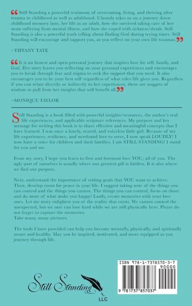 "For I know the thoughts that I think toward you, saith the LORD, thoughts of peace, and not of evil, to give you an expected end." Jeremiah 29:11 KJV Still Standing is a book filled with powerful insights/resources, the author's real life experiences, and applicable scripture references. My purpose and key message for writing this book is to share effective and meaningful concepts that I have learned. The tools I have provided can help you become mentally, physically, and spiritually aware and healthy. I was once a lonely, scared, and voiceless little girl. Because of my life experiences, resilience, and newfound love to serve, I now speak LOUDLY! I now have a voice for children and their families. I am STILL STANDING! I stand for you and me. From my story, I hope you learn to first and foremost love YOU; all of you. The ugly part of ourselves is usually where our greatest gift is hidden. It is also where we find our purpose. Next, understand the importance of setting goals that YOU want to achieve. Then, develop room for peace in your life. I suggest taking note of the things you can control and the things you cannot. The things you can control, focus on those and do more of what make you happy! Lastly, create memories with your loved ones. Let my story enlighten you of the reality that exists. We cannot control the unexpected, but we sure can love hard while we are still physically here. Please do not forget to capture the memories. Take many, many pictures.