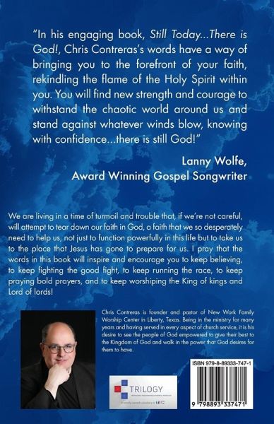 "In his engaging book, Still Today...There is God!, Chris Contreras's words have a way of bringing you to the forefront of your faith, rekindling the flame of the Holy Spirit within you. You will find new strength and courage to withstand the chaotic world around us and stand against whatever winds blow, knowing with confidence...there is still God!" Lanny Wolfe, Award Winning Gospel Songwriter We are living in a time of turmoil and trouble that, if we're not careful, will attempt to tear down our faith in God, a faith that we so desperately need to help us, not just to function powerfully in this life but to take us to the place that Jesus has gone to prepare for us. I pray that the words in this book will inspire and encourage you to keep believing, to keep fighting the good fight, to keep running the race, to keep praying bold prayers, and to keep worshiping the King of kings and Lord of lords!