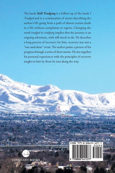 The book Still Trudging is a follow-up of the book I Trudged and is a continuation of stories describing the author's life going from a path of almost certain death to a life without complaints or regrets. Changing the word trudged to trudging implies that the journey is an ongoing adventure, with still much to do. He describes a long process of recovery; for him, recovery was not a "one-and-done" event. The author paints a picture of his progress through a series of short stories. He ties together his personal experiences with the principles of recovery taught to him by those he met along the way.