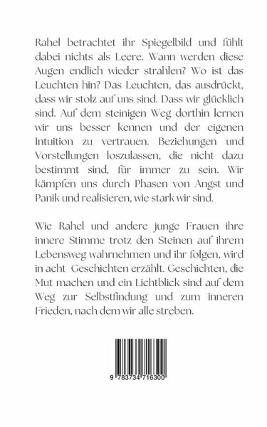 Rahel betrachtet ihr Spiegelbild und fühlt dabei nichts als Leere. Wann werden diese Augen endlich wieder strahlen? Wo ist das Leuchten hin? Das Leuchten, das ausdrückt, dass wir stolz auf uns sind. Dass wir glücklich sind. Auf dem steinigen Weg dorthin lernen wir uns besser kennen und der eigenen Intuition zu vertrauen. Beziehungen und Vorstellungen loszulassen, die nicht dazu bestimmt sind, für immer zu sein. Wir kämpfen uns durch Phasen von Angst und Panik und realisieren, wie stark wir sind. Wie Rahel und andere junge Frauen ihre innere Stimme trotz den Steinen auf ihrem Lebensweg wahrnehmen und ihr folgen, wird in acht Geschichten erzählt. Geschichten, die Mut machen und ein Lichtblick sind auf dem Weg zur Selbstfindung und zum Frieden, nach dem wir alle streben.