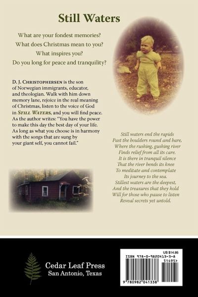 What are your fondest memories? What does Christmas mean to you? What inspires you? Do you want peace and tranquility? D. J. CHRISTOPHERSEN is the son of Norwegian immigrants, educator, and theologian. In this volume of memorable verse, walk with him down memory lane, rejoice in the real meaning of Christmas, listen to the voice of God in STILL WATERS, and you will find peace. As the author writes: "You have the power to make this day the best day of your life. As long as what you choose is in harmony with the songs that are sung by your giant self, you cannot fail."