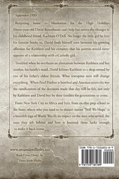 September 1939 – Returning home to Manhattan for the High Holidays fifteen-year-old David Rosenbaum can’t help but notice the changes in his childhood friend, Kathleen O’Dell. No longer the little girl he lent his favorite books to, David finds himself torn between his growing affection for Kathleen and his certainty that his parents would never approve of a relationship with a Catholic girl. Troubled when he overhears an altercation between Kathleen and her mother, his family’s maid, David follows Kathleen to a shop owned by one of his father’s oldest friends. What transpires next will change everything. When Pearl Harbor is bombed and America enters the war the ramifications of the decisions made that day will be felt, not only by Kathleen and David but by their families for generations to come. From New York City to Africa and Italy, from an elite prep school to the front, where who you used to be doesn’t matter "Still We Hope" is a heartfelt saga of World War II; its impact on the men who served, the ones they left behind and how it haunted those lucky enough to make it back home.