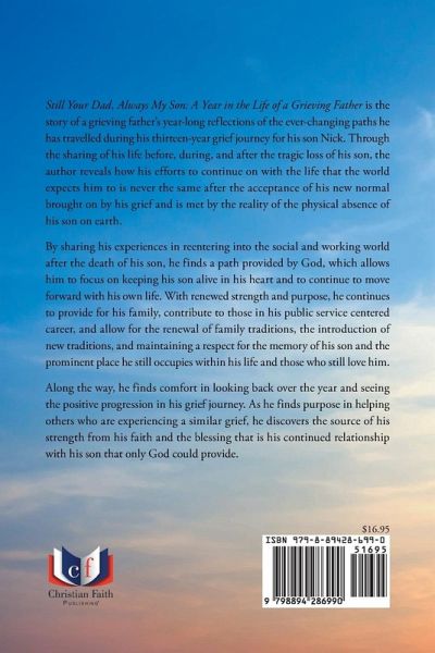 Still Your Dad, Always My Son: A Year in the Life of a Grieving Father is the story of a grieving father's year-long reflections of the ever-changing paths he has travelled during his thirteen-year grief journey for his son Nick. Through the sharing of his life before, during, and after the tragic loss of his son, the author reveals how his efforts to continue on with the life that the world expects him to is never the same after the acceptance of his new normal brought on by his grief and is met by the reality of the physical absence of his son on earth. By sharing his experiences in reentering into the social and working world after the death of his son, he finds a path provided by God, which allows him to focus on keeping his son alive in his heart and to continue to move forward with his own life. With renewed strength and purpose, he continues to provide for his family, contribute to those in his public service centered career, and allow for the renewal of family traditions, the introduction of new traditions, and maintaining a respect for the memory of his son and the prominent place he still occupies within his life and those who still love him. Along the way, he finds comfort in looking back over the year and seeing the positive progression in his grief journey. As he finds purpose in helping others who are experiencing a similar grief, he discovers the source of his strength from his faith and the blessing that is his continued relationship with his son that only God could provide.