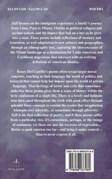 Have you ever yearned to embark on a profound journey of self-discovery, love, and connection? Look no further than Still, the captivating debut poetry collection by award-winning author Renzo Del Castillo that will transport you to the heart of a family's journey from Lima, Peru to Miami, Florida as political refugees and asylum seekers. Through beautifully crafted poems, Del Castillo invites you to witness the lasting impact of this transformative experience on a young boy as he grew into a man. Still is not just another poetry book; it's a portal to understanding the complexities of adapting to new cultures and geographies, woven together with memories and transitions that will resonate with your soul. In this groundbreaking anthology, you will: Uncover the interconnectedness of self-discovery through a sepia-toned, nostalgic journey that will leave you breathless. Experience the transformative potential of connecting with others, traveling the world, and the evocative feelings of culture and familial ties that will tug at your heartstrings. Confront the absurdity and beauty of love at first sight, and how it can change your life forever. Pay tribute to the homeland and gain a deeper understanding of the trials and tribulations that come with immigrating to a new country. Find hidden meanings in the things often left undiscovered through thought-provoking and brilliant poetry that will expand your mind. Enjoy poems translated into both Spanish and French, making this collection accessible to a wider audience and showcasing the universality of the immigrant experience. Still is not just another poetry book; it's a life-changing experience that will stay with you long after you've turned the final page. With undertones of the Beats and Pablo Neruda, and a concise and impactful style that explores love, immigration, travel, and more through vivid imagery and storytelling, this collection is a must-have for anyone seeking to broaden their understanding of empathy, connection, and the power of self-discovery. But don't just take our word for it. Acclaimed authors have praised Still as a brilliant work of poetry that creates stories in the mind, relates to deep introspection, and offers an out-of-body perspective. Del Castillo's words are raw, real, and full of love, humor, and clarity, making this collection an essential addition to your library. So, what are you waiting for? If you're ready to embark on a life-changing journey through the power of poetry, scroll up and click "Add to Cart" now. Still is the key to unlocking a world of self-discovery, love, and connection that will transform your life forever. Don't miss out on this extraordinary opportunity to immerse yourself in the captivating world of Renzo Del Castillo's poetry. Order your copy today!