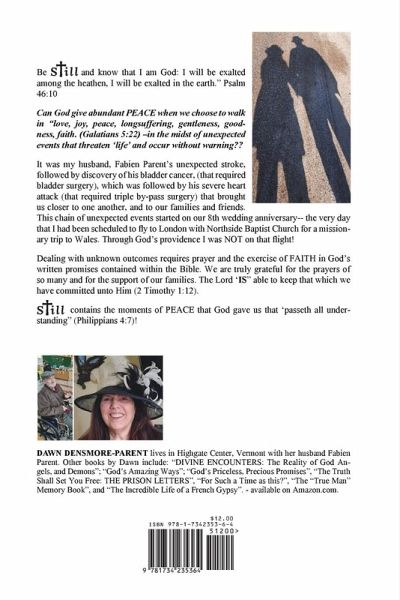 "still" Be "still" and know that I am God: I will be exalted among the heathen, I will be exalted in the earth." Psalm 46:10 Can God give abundant PEACE when we choose to walk in "love, joy, peace, longsuffering, gentleness, goodness, faith. (Galatians 5:22) -in the midst of unexpected events that threaten 'life' and occur without warning?? It was my husband, Fabien Parent's unexpected stroke, followed by discovery of his bladder cancer, (that required bladder surgery), which was followed by his severe heart attack (that required triple by-pass surgery) that brought us closer to one another, and to our families and friends. This chain of unexpected events started on our 8th wedding anniversary-- the very day that I had been scheduled to fly to London with Northside Baptist Church for a missionary trip to Wales. Through God's providence I was NOT on that flight! Dealing with unknown outcomes requires prayer and the exercise of FAITH in God's written promises contained within the Bible. We are truly grateful for the prayers of so many and for the support of our families. The Lord 'IS" able to keep that which we have committed unto Him (2 Timothy 1:12). "STILL" contains the moments of PEACE that God gave us that 'passeth all understanding" (Philippians 4:7)!