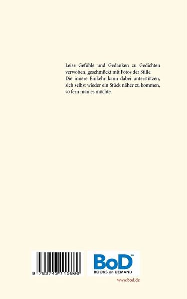 Leise Gefühle und Gedanken zu Gedichten verwoben, geschmückt mit Fotos der Stille.Die innere Einkehr kann dabei unterstützen, sich selbst wieder ein Stück näher zu kommen, so fern man es möchte.