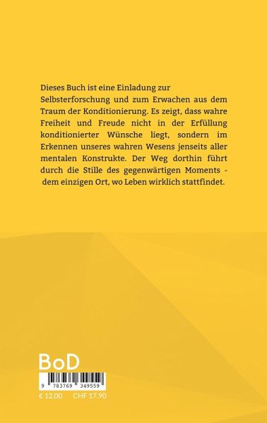 Dieses Buch ist eine Einladung zur Selbsterforschung und zum Erwachen aus dem Traum der Konditionierung. Es zeigt, dass wahre Freiheit und Freude nicht in der Erfüllung konditionierter Wünsche liegt, sondern im Erkennen unseres wahren Wesens jenseits aller mentalen Konstrukte. Der Weg dorthin führt durch die Stille des gegenwärtigen Moments - dem einzigen Ort, wo Leben wirklich stattfindet.