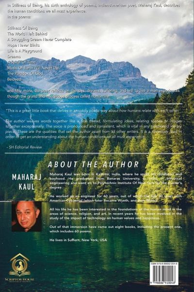 In Stillness of Being, his sixth anthology of poems, Indian-American poet, Maharaj Kaul, describes the human conditions we all must experience. In the poems: Stillness Of Being The World I Left Behind A Struggling Dream Never Complete Hope Never Blinks Life Is A Playground Dreams A Spiral Of Time Music Of Earth Will Never Die The Paradox Of God Beloved. In the poems: Stillness Of Being The World I left Behind A Struggling Dream Never Complete Hope Never Blinks Life Is A Playground Dreams A Spiral Of Time Music Of Earth Will Never Die The Paradox Of God Beloved and fifty more, the poet reflects on the joys, dreams, suffering, and will to live a man experiences though the grand and mysterious process called human life. From the poem Stillness of Being: Mind plots revolutions, But inner being wants harmony. Life came with music, But world moves by agenda. Childhood was a pristine dream, But wisdom turned that into a project. Ambitions vault our existence, Energy seethes from our pores. But we came with a faith, Our elements beckon tranquility. There is a more sublime state than success, World wants tumult but soul seeks stillness.