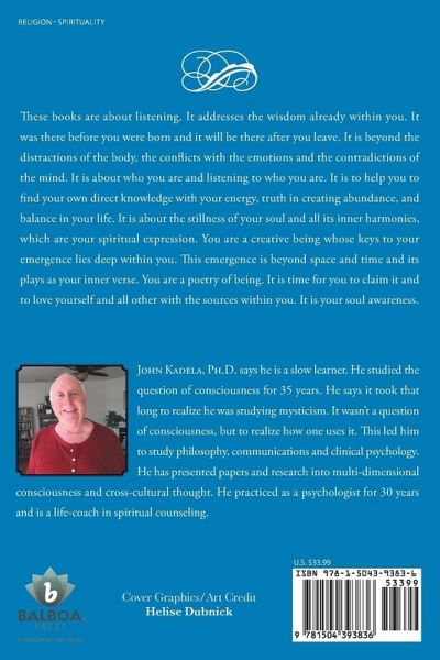 These books are about listening. It addresses the wisdom already within you. It was there before you were born and it will be there after you leave. It is beyond the distractions of the body, the conflicts with the emotions and the contradictions of the mind. It is about who you are and listening to who you are. It is to help you to find your own direct knowledge with your energy, truth in creating abundance, and balance in your life. It is about the stillness of your soul and all its inner harmonies, which are your spiritual expression. You are a creative being whose keys to your emergence lies deep within you. This emergence is beyond space and time and its plays as your inner verse. You are a poetry of being. It is time for you to claim it and to love yourself and all other with the sources within you. It is your soul awareness.