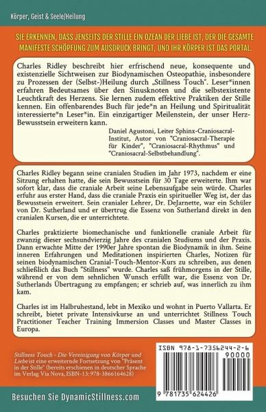 "Du erkennst, dass jenseits der Stille ein Ozean der Liebe ist, der die gesamte manifeste Schöpfung zum Ausdruck bringt, und dein Körper ist das Portal." Diese erfahrungsorientierte Fortsetzung von Präsent in der Stille kombiniert uralte spirituelle Praktiken mit der von William G. Sutherland's inspirierten Stillness Touch, um den Körper wieder mit der Liebe zu vereinen. Durch tiefgreifende Meditationen, Berührungspraktiken und detaillierte Studienanleitungen führt Charles Ridley den Leser durch eine unerforschte Reise in der Evolution des Bewusstseins. Dieser umfassende Leitfaden erforscht sowohl alte als auch moderne Praktiken sowie unsere zentralen inneren Herausforderungen und unbewussten Rückschläge bei der Wiedervereinigung der Liebe mit dem Herzen durch Berührung. Charles Ridley begann seine Schädelstudien 1973, nachdem er eine Sitzung erhalten hatte, die sein Bewusstsein für 30 Tage erweiterte. Ihm war sofort klar, dass die craniale Arbeit seine Lebensaufgabe sein würde. Charles erfuhr aus erster Hand, dass die craniale Praxis ein spiritueller Weg ist, der das Bewusstsein erweitert. Sein Cranial-Lehrer, Dr. DeJarnette, war ein Schüler von Dr. Sutherland, und er gab die Essenz von Sutherland in seinen Cranial-Kursen direkt weiter. Charles hat zwanzig seiner achtundvierzig Jahre, in denen er den Schädel studierte und praktizierte, biomechanische und funktionelle Schädelarbeit praktiziert. Dann erwachte die Biodynamik Mitte der 1990er Jahre spontan in ihm. Seine inneren Erfahrungen und Meditationen inspirierten Charles dazu, Notizen für seinen Biodynamic Cranial Touch Mentor Course zu schreiben, aus denen schließlich das Buch "Stillness" wurde. Charles saß frühmorgens in der Stille, während er von dem sehnlichen Wunsch erfüllt war, die Essenz von Dr. Sutherlands Übertragung zu empfangen; er schrieb auf, was ihm innerlich kam.