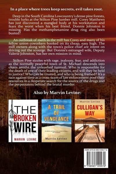 In a place where trees keep secrets, evil takes root. Deep in the South Carolina Lowcountry's dense pine forests, trouble lurks in the Stilton Pine lumber mill. Corey Matthews has discovered a mangled body at his workstation and fears the worst when his best friend, Donnie, is missing. Has the mill's clandestine meth ring he depends on been busted as well? Stilton Pine sizzles with rage, jealousy, fear, and addiction as the normally peaceful town of St. Michael descends into chaos amidst the unleashed turmoil. Who is responsible for the death of one of their leading citizens? Who can be trusted, and who is being framed? It's a race against time as a cross-team of law enforcement pool their resources in a desperate search for the source of the drugs and the perpetrators behind the brutal murder.
