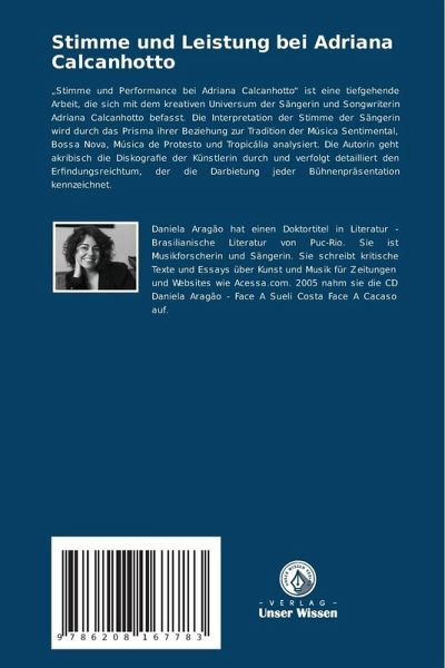 "Stimme und Performance bei Adriana Calcanhotto" ist eine tiefgehende Arbeit, die sich mit dem kreativen Universum der Sängerin und Songwriterin Adriana Calcanhotto befasst. Die Interpretation der Stimme der Sängerin wird durch das Prisma ihrer Beziehung zur Tradition der Música Sentimental, Bossa Nova, Música de Protesto und Tropicália analysiert. Die Autorin geht akribisch die Diskografie der Künstlerin durch und verfolgt detailliert den Erfindungsreichtum, der die Darbietung jeder Bühnenpräsentation kennzeichnet.
