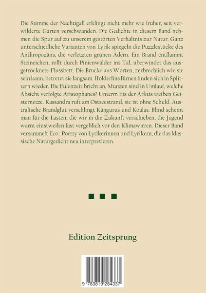 Die Stimme der Nachtigall erklingt nicht mehr wie früher, seit verwilderte Gärten verschwanden. Die Gedichte in diesem Band nehmen die Spur auf zu unserem gestörten Verhältnis zur Natur. Ganz unterschiedliche Varianten von Lyrik spiegeln die Puzzlestücke des Anthropozäns, die verletzten grünen Adern. Ein Brand entflammt Steineichen, rollt durch Pinienwälder ins Tal, überwindet das ausgetrocknete Flussbett. Die Brücke aus Worten, zerbrechlich wie sie sein kann, betretet sie langsam. Hölderlins Birnen finden sich in Splittern wieder. Die Eulenzeit bricht an, Münzen sind in Umlauf, welche Absicht verfolgte Aristophanes? Unterm Eis der Arktis treiben Geisternetze. Kassandra ruft am Ostseestrand, sie ist ohne Schuld. Australische Brandglut verschlingt Kängurus und Koalas. Blind scheint man für die Lasten, die wir in die Zukunft verschieben, die Jugend warnt einstweilen fast vergeblich vor den Klimawirren. Dieser Band versammelt Eco : Poetry von Lyrikerinnen und Lyrikern, die das klassische Naturgedicht neu interpretieren.