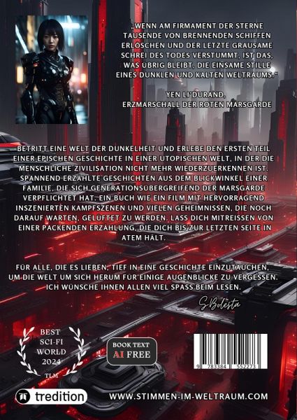 "Stimmen im Weltraum" ist eine Militär-Science-Fiction-Romanreihe, des Autors Stanislaw Bolesta. Die Handlung spielt in einer utopischen Welt, die sich völlig von der uns heute bekannten Zivilisation unterscheidet. Im Mittelpunkt der Handlung stehen drei Familien, die den Entschluss gefasst haben, den berühmten Garden beizutreten. Obwohl die Garden sich in ihren Merkmalen deutlich voneinander unterscheiden, stehen sie vereint gegen die Feinde des neolizianischen Zeitalters der Menschheit. Eine Welt getaucht in eine düstere Atmosphäre, geprägt von Konflikten im Schatten einer uralten, nicht menschlichen Zivilisation, die vor den Menschen das Sonnensystem beherrschte.Mit unerschütterlicher Hingabe und Loyalität versuchen die Erdgarde, die Mondgarde und die Marsgarde ihre Heimatwelten gegen alle Widrigkeiten zu schützen.Die Mitglieder dieser Eliteeinheiten verbindet ein starkes Band, das auf jahrhundertealten Traditionen und Werten beruht. Diese drei wichtigsten militärischen Organisationen entwickeln sich im Laufe der Zeit zu einem integralen Bestandteil des Gardistenlebens und bilden für die Protagonisten der Romanreihe eine treue Gemeinschaft. Die Angehörigen der drei Familien haben sich verpflichtet, dem harten Training und den strengen Regeln der Garden zu unterwerfen, was sie physisch und psychisch für immer verändert.Die Geschichten der Familien, ihre Erfolge und Niederlagen, ihre Beziehungen und Entbehrungen werden in kurzen, zeitlich begrenzten Episoden erzählt,die einen wesentlichen Teil der Romane ausmachen und sich am Ende zu einem großen Ganzen zusammenfügen. Die Romane entführen den Leser in eine Welt,in der Spannung, Action und Emotionen miteinander verschmelzen und eine Zukunft der Menschheit aufzeigen, die sowohl faszinierend als auch beängstigend ist.Die Formulierung 'Best Sci-Fi World 2024 (TLM)' auf dem Buchcover bezieht sich auf das Urteil freiwilliger Testleser und stellt keine offizielle Auszeichnung oder Bewertung durch Dritte dar.