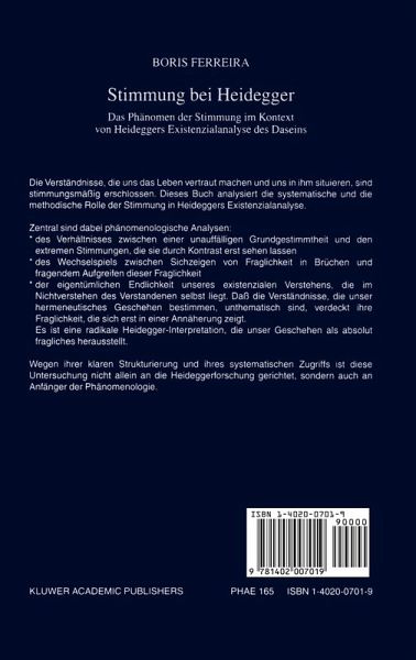 des Verhältnisses zwischen einer unauffälligen Grundgestimmtheit und den extremen Stimmungen, die sie durch Kontrast erst sehen lassen; des Wechselspiels zwischen Sichzeigen von Fraglichkeit in Brüchen und fragendem Aufgreifen dieser Fraglichkeit; und der eigentümlichen Endlichkeit unseres existenzialen Verstehens, die im Nichtverstehen des Verstandenen selbst liegt. Daß die Verständnisse, die unser hermeneutisches Geschehen bestimmen, unthematisch sind, verdeckt ihre Fraglichkeit, die sich erst in einer Annäherung zeigt. Es ist eine radikale Heidegger-Interpretation, die unser Geschehen als absolut fragliches herausstellt. Wegen ihrer klaren Strukturierung und ihres systematischen Zugriffs ist diese Untersuchung nicht allein an die Heideggerforschung gerichtet, sondern auch an Anfänger der Phänomenologie.