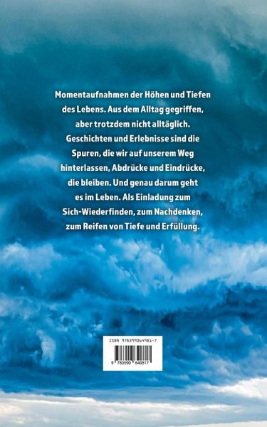 Momentaufnahmen der Höhen und Tiefen des Lebens. Aus dem Alltag gegriffen, aber trotzdem nicht alltäglich. Geschichten und Erlebnisse sind die Spuren, die wir auf unserem Weg hinterlassen, Abdrücke und Eindrücke, die bleiben. Und genau darum geht es im Leben. Als Einladung zum Sich-Wiederfinden, zum Nachdenken, zum Reifen von Tiefe und Erfüllung.