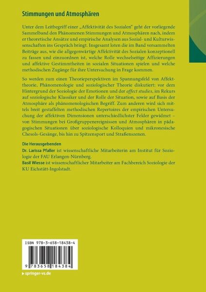 So werden zum einen Theorieperspektiven im Spannungsfeld von Affekttheorie, Phänomenologie und soziologischer Theorie diskutiert: vor dem Hintergrund der Soziologie der Emotionen und der affect studies, im Rekurs auf soziologische Klassiker und der Rolle der Situation, sowie auf Basis der Atmosphäre als phänomenologischen Begriff. Zum anderen wird sich mittels breit gestaffelten methodischen Repertoires der empirischen Untersuchung der affektiven Dimensionen unterschiedlichster Felder gewidmet - von Stimmungen bei Großgruppenereignissen und Atmosphären in pädagogischen Situationen über soziologische Kolloquien und mikronesische Chesols-Gesänge, bis hin zu Spitzensport und Straßenszenen.
