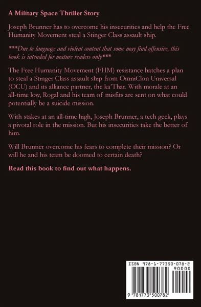 A Military Space Thriller Story Joseph Brunner has to overcome his insecurities and help the Free Humanity Movement steal a Stinger Class assault ship. ******Due to language and violent content that some may find offensive, this book is intended for mature readers only*** The Free Humanity Movement (FHM) resistance hatches a plan to steal a Stinger Class assault ship from OmniClon Universal (OCU) and its alliance partner, the ka’Thar. With morale at an all-time low, Rogal and his team of misfits are sent on what could potentially be a suicide mission. With stakes at an all-time high, Joseph Brunner, a tech geek, plays a pivotal role in the mission. But his insecurities take the better of him. Will Brunner overcome his fears to complete their mission? Or will he and his team be doomed to certain death? Read this book to find out what happens.