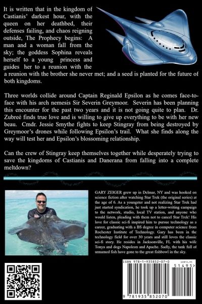 It is written that in the kingdom of Castianis' darkest hour, with the queen on her deathbed, their defenses failing, and chaos reigning outside, The Prophecy begins: A man and a woman fall from the sky; the goddess Sophina reveals herself to a young princess and guides her to a reunion with the brother she never met; and a seed is planted for the future of both kingdoms. Three worlds collide around Captain Reginald Epsilon as he comes face-to-face with his arch nemesis Sir Severin Greymoor. Severin has been planning this encounter for the past two years and it is not going quite to plan. Dr. Zubreé finds true love and is willing to give up everything to be with her new beau. Cmdr. Jessie Smythe fights to keep Stingray from being destroyed by Greymoor's drones while following Epsilon's trail. What she finds along the way will test her and Epsilon's blossoming relationship. Can the crew of Stingray keep themselves together while desperately trying to save the kingdoms of Castianis and Danerana from falling into a complete meltdown?