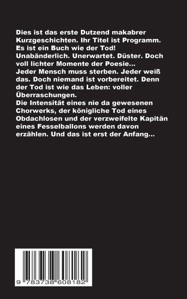 Dies ist das erste Dutzend makabrer Kurzgeschichten. Ihr Titel ist Programm. Es ist ein Buch wie der Tod! Unabänderlich. Unerwartet. Düster. Doch voll lichter Momente der Poesie...Jeder Mensch muss sterben. Jeder weiß das. Doch niemand ist vorbereitet. Denn der Tod ist wie das Leben: voller Überraschungen.Die Intensität eines nie da gewesenen Chorwerks, der königliche Tod eines Obdachlosen und der verzweifelte Kapitän eines Fesselballons werden davon erzählen. Und das ist erst der Anfang...