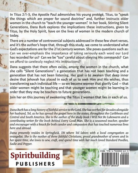 In Titus 2:1-5, the Apostle Paul admonishes his young protégé, Titus, to "speak the things which are proper for sound doctrine" and, further instructs older women in the church to "teach the younger women". In her book, Stirring Silent Generations, Dana Burk explores the implications these instructions, given to Titus, by the Holy Spirit, have on the lives of women in the modern church of today. There are a number of controversial subjects addressed in these few short verses, and it's the author's hope that, through this study, we come to understand what God's expectations are for the 21st century woman. She poses questions such as: Can we over-emphasis the importance of taking seriously each word our Lord has recorded for us? Can we be "too" careful about obeying His commands? Can we afford to carelessly neglect His instructions? Dana suggests that there often exists, among the women in the church, what she calls "Silent Generations": a generation that has not been teaching and a generation that has not been listening. Her goal is to awaken that deep inner desire that Jehovah has placed in each of us to seek Him and His wishes, thus transforming each individual life - so we become women that glorify God - that older women might be teaching and that younger women might be learning in order that they may be teachers to future generations. Join her on this journey of awakening the Titus 2 woman that lies in each of us.