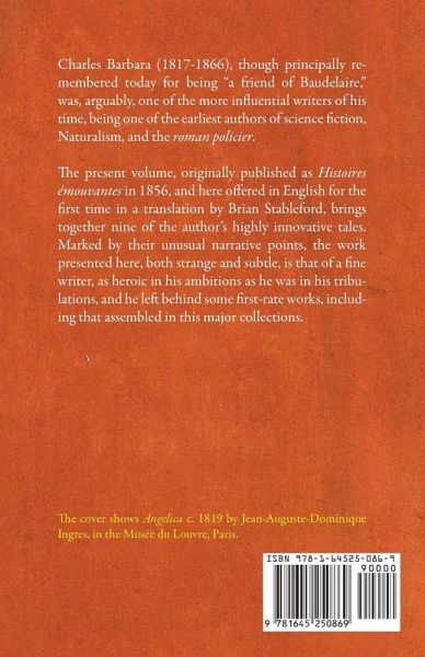 Charles Barbara (1817-1866), though principally remembered today for being "a friend of Baudelaire," was, arguably, one of the more influential writers of his time, being one of the earliest authors of science fiction, Naturalism, and the roman policier. The present volume, originally published as Histoires émouvantes in 1856, and here offered in English for the first time in a translation by Brian Stableford, brings together nine of the author's highly innovative tales. Marked by their unusual narrative points, the work presented here, both strange and subtle, is that of a fine writer, as heroic in his ambitions as he was in his tribulations, and he left behind some first-rate works, including that assembled in this major collections.
