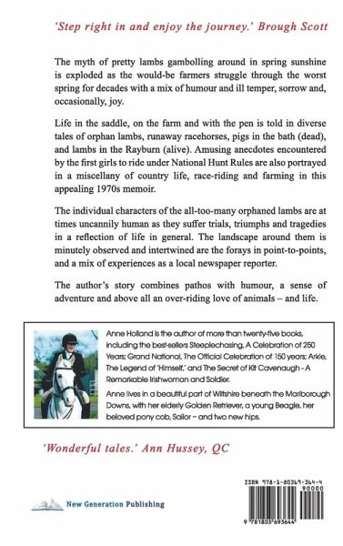 'Step right in and enjoy the journey.' Brough Scott The myth of pretty lambs gambolling around in spring sunshine is exploded as the would-be farmers struggle through the worst spring for decades with a mix of humour and ill temper, sorrow and, occasionally, joy. Life in the saddle, on the farm and with the pen is told in diverse tales of orphan lambs, runaway racehorses, pigs in the bath (dead), and lambs in the Rayburn (alive). Amusing anecdotes encountered by the first girls to ride under National Hunt Rules are also portrayed in a miscellany of country life, race-riding and farming in this appealing 1970s memoir. The individual characters of the all-too-many orphaned lambs are at times uncannily human as they suffer trials, triumphs and tragedies in a reflection of life in general. The landscape around them is minutely observed and intertwined are the forays in point-to-points, and a mix of experiences as a local newspaper reporter. The author's story combines pathos with humour, a sense of adventure and above all an over-riding love of animals - and life. About the Author Anne Holland is the author of more than twenty-five books, including the best-sellers Steeplechasing, A Celebration of 250 Years; Grand National, The Official Celebration of 150 years; Arkle, The Legend of 'Himself,' and The Secret of Kit Cavenaugh - A Remarkable Irishwoman and Soldier. Anne lives in a beautiful part of Wiltshire beneath the Marlborough Downs, with her elderly Golden Retriever, a young Beagle, her beloved pony cob, Sailor - and two new hips. Author praise: 'Wonderful tales.' Ann Hussey, QC