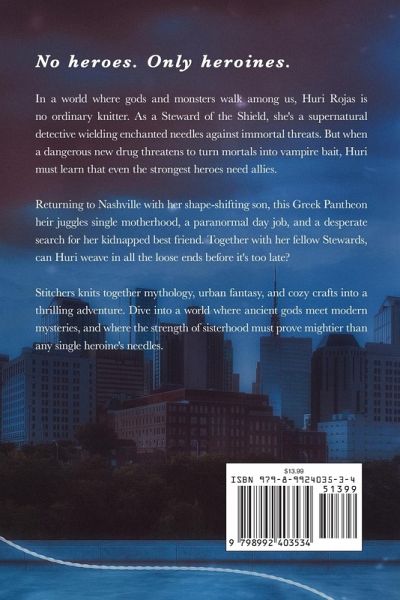 No heroes. Only heroines. In a world where gods and monsters walk among us, Huri Rojas is no ordinary knitter. As a Steward of the Shield, she's a supernatural detective wielding enchanted needles against immortal threats. But when a dangerous new drug threatens to turn mortals into vampire bait, Huri must learn that even the strongest heroes need allies. Returning to Nashville with her shape-shifting son, this Greek Pantheon heir juggles single motherhood, a paranormal day job, and a desperate search for her kidnapped best friend. Together with her fellow Stewards, can Huri weave in all the loose ends before it's too late? Stitchers knits together mythology, urban fantasy, and cozy crafts into a thrilling adventure. Dive into a world where ancient gods meet modern mysteries, and where the strength of sisterhood must prove mightier than any single heroine's needles.