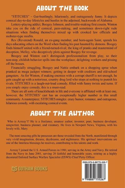 "STITCHES" - Gut-bustlingly, hilariously, and outrageously funny. The story depicts the overall comical day-to-day lifestyles and hustles in adjoined small cities in the back woods of Alabama. Lottery-playing addict, Boogey Johnson and his trouble starting, first cousin, Winton take you on a daily ride in their lives which are comical, pain staking and sometimes down-right rude as they find themselves mixed up with crocked law officials and a gang of mobster-type misfits. Rev (Reverend) Ronald, an ex-gang member, turn born again Saint, spends his day educate others on life through the Word but finds his past haunting him as he is continually visited by his fleshly and spiritual demons. Boogey finds himself united with a friend turn rival; the king of pranks and mastermind of deception, Melley,who deceptively plots against Boogey for revenge. Boogey and Winton are unable to distinguish their professional demeanor from everyday play, as well as their co-workers, whose non-stop, childish behavior spills over into the workplace as they delight other workers and constantly piss off their bosses. Financially struggling, Boogey and wife Nattie embark on a shopping spree after pranked into thinking they are mega jackpot winners but find themselves in even deep trouble with creditors and old school gang members. As for Winton, if making enemies with a corrupt sheriff is not enough, he turns around and get caught up with a notorious, dangerous, country drug lord who stops at nothing to punish those who cheat him. STITCHES is a laugh-out-loud comedy written with a solid storyline and a myriad of funny twists and turns. If you simply enjoy comedy, this is a must read. If you love hilarious comedy, then spend a quiet afternoon with this one. There are all sorts of knuckleheads in life. Every is affiliated with atleast one but these comical idiots are not uncommon; however, STITCHES' cast has and exceptionally higher concentration than most in this small community. It is a masterpiece that melds a little of everything: crazy humor, romance, and outrageous, hilarious comedy, with escalating comical events about day-to-day living in these surrounding small, country cities. Excerpts: 1. The brick silently glides high, in slow motion from her drunkenness, fading into darkness until reappearing in the light from the back of the general store, reflecting against the house in a flash. Kaboomaloomaloomaloom! The brick tumbles... 2. The sheriff does some more fancy legwork, then leans forward, hauling back and slapping Melley face as hard as he can with an open hand, and blood instantly rushes from... 3. Boogey brother& face frowns without delay, realizing he been stomping poop when frowning worse while still holding Boogey shoulder when hopping, trying to... 4. Nattie finally registers the heavy popping and finds Boogey shielding his face from the grease and steam when dropping the turkey and jumping back, quick, smiling. Dangit, Boogey! Run for the hills, yawl! Run for your lives! Nattie screams...