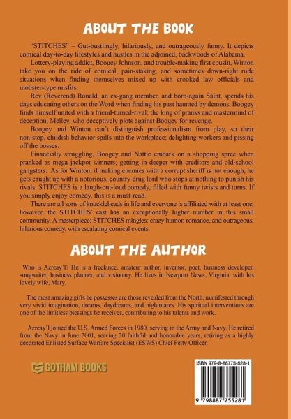 "STITCHES" - Gut-bustlingly, hilariously, and outrageously funny. The story depicts the overall comical day-to-day lifestyles and hustles in adjoined small cities in the back woods of Alabama. Lottery-playing addict, Boogey Johnson and his trouble starting, first cousin, Winton take you on a daily ride in their lives which are comical, pain staking and sometimes down-right rude as they find themselves mixed up with crocked law officials and a gang of mobster-type misfits. Rev (Reverend) Ronald, an ex-gang member, turn born again Saint, spends his day educate others on life through the Word but finds his past haunting him as he is continually visited by his fleshly and spiritual demons. Boogey finds himself united with a friend turn rival; the king of pranks and mastermind of deception, Melley, who deceptively plots against Boogey for revenge. Boogey and Winton are unable to distinguish their professional demeanor from everyday play, as well as their co-workers, whose non-stop, childish behavior spills over into the workplace as they delight other workers and constantly piss off their bosses. Financially struggling, Boogey and wife Nattie embark on a shopping spree after pranked into thinking they are mega jackpot winners but find themselves in even deep trouble with creditors and old school gang members. As for Winton, if making enemies with a corrupt sheriff is not enough, he turns around and get caught up with a notorious, dangerous, country drug lord who stops at nothing to punish those who cheat him. STITCHES is a laugh-out-loud comedy written with a solid storyline and a myriad of funny twists and turns. If you simply enjoy comedy, this is a must read. If you love hilarious comedy, then spend a quiet afternoon with this one. There are all sorts of knuckleheads in life. Every is affiliated with atleast one but these comical idiots are not uncommon; however, STITCHES' cast has and exceptionally higher concentration than most in this small community. It is a masterpiece that melds a little of everything: crazy humor, romance, and outrageous, hilarious comedy, with escalating comical events about day-to-day living in these surrounding small, country cities. Excerpts: 1. The brick silently glides high, in slow motion from her drunkenness, fading into darkness until reappearing in the light from the back of the general store, reflecting against the house in a flash. Kaboomaloomaloomaloom! The brick tumbles... 2. The sheriff does some more fancy legwork, then leans forward, hauling back and slapping Melley face as hard as he can with an open hand, and blood instantly rushes from... 3. Boogey brother& face frowns without delay, realizing he been stomping poop when frowning worse while still holding Boogey shoulder when hopping, trying to... 4. Nattie finally registers the heavy popping and finds Boogey shielding his face from the grease and steam when dropping the turkey and jumping back, quick, smiling. Dangit, Boogey! Run for the hills, yawl! Run for your lives! Nattie screams...
