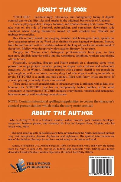 "STITCHES" - Gut-bustlingly, hilariously, and outrageously funny. It depicts comical day-to-day lifestyles and hustles in the adjoined, backwoods of Alabama. Lottery-playing addict, Boogey Johnson, and trouble-making first cousin, Winton take you on the ride of comical, pain-staking, and sometimes down-right rude situations when finding themselves mixed up with crooked law officials and mobster-type misfits. Rev (Reverend) Ronald, an ex-gang member, and born-again Saint, spends his days educating others on the Word when finding his past haunted by demons. Boogey finds himself united with a friend-turned-rival; the king of pranks and mastermind of deception, Melley, who deceptively plots against Boogey for revenge. Boogey and Winton can't distinguish professionalism from play, so their non-stop, childish behavior spills into the workplace; delighting workers and pissing off the bosses. Financially struggling, Boogey and Nattie embark on a shopping spree when pranked as mega jackpot winners; getting in deeper with creditors and old-school gangsters. As for Winton, if making enemies with a corrupt sheriff is not enough, he gets caught up with a notorious, country drug lord who stops at nothing to punish his rivals. STITCHES is a laugh-out-loud comedy, filled with funny twists and turns. If you simply enjoy comedy. this is a must-read. There are all sorts of knuckleheads in life and everyone is affiliated with at least one, however. the STITCHES' cast has an exceptionally higher number in this small community. A masterpiece: STITCHES mingles crazy humor, romance, and outrageous, hilarious comedy, with escalating comical events.