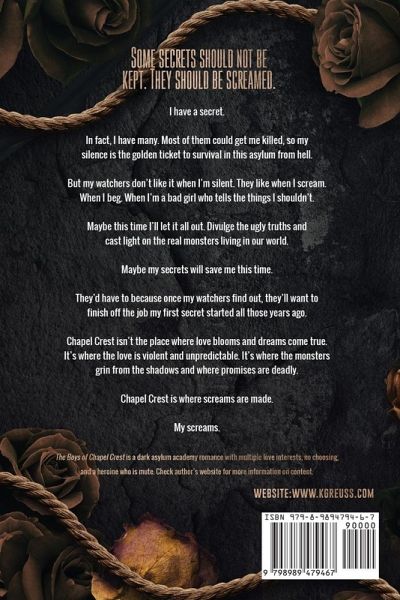 Some secrets should not be kept. They should be screamed. I have a secret. In fact, I have many. Most of them could get me killed, so my silence is the golden ticket to survival in this asylum from hell. But my watchers don't like it when I'm silent. They like when I scream. When I beg. When I'm a bad girl who tells the things I shouldn't. Maybe this time I'll let it all out. Divulge the ugly truths and cast light on the real monsters living in our world. Maybe my secrets will save me this time. They'd have to because once my watchers find out, they'll want to finish off the job my first secret started all those years ago. Chapel Crest isn't the place where love blooms and dreams come true. It's where the love is violent and unpredictable. It's where the monsters grin from the shadows and where promises are deadly. Chapel Crest is where screams are made. My screams. The Boys of Chapel Crest is a dark asylum academy romance with multiple love interests, no choosing, and a heroine who is mute. Check author's website for more information on content.
