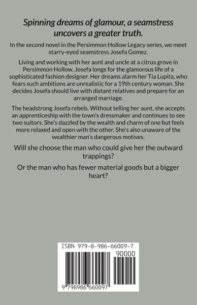Spinning dreams of glamour, a seamstress uncovers a greater truth. In the second novel in the Persimmon Hollow Legacy series, we meet starry-eyed seamstress Josefa Gomez. Living and working with her aunt and uncle at a citrus grove in Persimmon Hollow, Josefa longs for the glamorous life of a sophisticated fashion designer. Her dreams alarm her Tía Lupita, who fears such ambitions are unrealistic for a 19th century woman. She decides Josefa should live with distant relatives and prepare for an arranged marriage. The headstrong Josefa rebels. Without telling her aunt, she accepts an apprenticeship with the town's dressmaker and continues to see two suitors. She's dazzled by the wealth and charm of one but feels more relaxed and open with the other. She's also unaware of the wealthier man's dangerous motives. Will she choose the man who could give her the outward trappings? Or the man who has fewer material goods but a bigger heart?