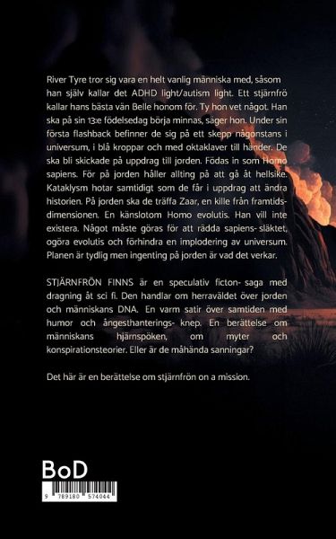 River Tyre tror sig vara en helt vanlig människa med, såsom han kallar det, ADHD light/autism light. Ett stjärnfrö, kallar hans bästa vän Belle honom för. Ty hon vet något. Hon vet vem han egentligen är. Han ska på sin 13:e födelsedag börja minnas, säger hon. Under sin första flashback befinner de båda sig på ett skepp någonstans i universum, i blå kroppar och med oktaklaver till händer. De ska bli skickade på uppdrag till jorden. Födas in som Homo sapiens. För på jorden håller allting på att gå åt hellsike. Kataklysm hotar samtidigt som de får i uppdrag att ändra historien. På jorden ska de träffa Zaar, en kille från framtids-dimensionen. En känslotom Homo evolutis. Han vill inte existera. Något måste göras för att rädda Homo sapiens släktet, ogöra evolutis och förhindra en implodering av universum. Något som oundvikligen kommer att ske om inte sapiens frigörs från sinnenas parasiter. Planen är tydlig men ingenting på jorden är vad det verkar. STJÄRNFRÖN FINNS är en speculativ fiction-saga med dragning åt sci-fi. Den handlar om ett krig mellan mörker och ljus. Om Homo sapiens DNA och om herraväldet över jorden. Om människor och deras hjärnspöken. Om reptiler, entiteter, Anunnaki och stjärnfrön. En varm, ångestladdad satir över samtiden. Med humor och ångesthanterings-knep. En berättelse om människans ego, vanföreställningar och konspirationsteorier. Eller är det måhända sanningar? Detta är en berättelse om stjärnfrön on a mission.