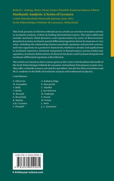 This book presents in thirteen refereed survey articles an overview of modern activity in stochastic analysis, written by leading international experts. The topics addressed include stochastic fluid dynamics and regularization by noise of deterministic dynamical systems; stochastic partial differential equations driven by Gaussian or Lévy noise, including the relationship between parabolic equations and particle systems, and wave equations in a geometric framework; Malliavin calculus and applications to stochastic numerics; stochastic integration in Banach spaces; porous media-type equations; stochastic deformations of classical mechanics and Feynman integrals and stochastic differential equations with reflection.