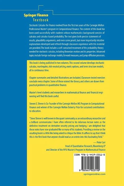 "Steven Shreve's comprehensive two-volume Stochastic Calculus for Finance may well be the last word, at least for a while, in the flood of Master's level books.... a detailed and authoritative reference for "quants" (formerly known as "rocket scientists"). The books are derived from lecture notes that have been available on the Web for years and that have developed a huge cult following among students, instructors, and practitioners. The key ideas presented in these works involve the mathematical theory of securities pricing based upon the ideas of classical finance....the beauty of mathematics is partly in the fact that it is self-contained and allows us to explore the logical implications of our hypotheses. The material of this volume of Shreve's text is a wonderful display of the use of mathematical probability to derive a large set of results from a small set of assumptions.In summary, this is a well-written text that treats the key classical models of finance through an applied probability approach. It is accessible to a broad audience and has been developed after years of teaching the subject. It should serve as an excellent introduction for anyone studying the mathematics of the classical theory of finance." (SIAM, 2005)