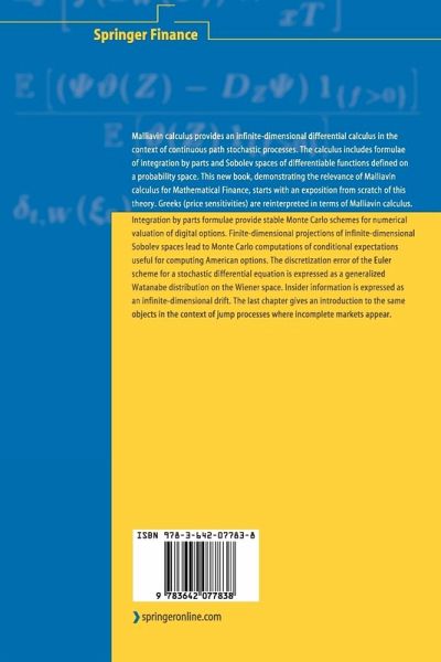 Malliavin calculus provides an infinite-dimensional differential calculus in the context of continuous paths stochastic processes. The calculus includes formulae of integration by parts and Sobolev spaces of differentiable functions defined on a probability space. This new book, demonstrating the relevance of Malliavin calculus for Mathematical Finance, starts with an exposition from scratch of this theory. Greeks (price sensitivities) are reinterpreted in terms of Malliavin calculus. Integration by parts formulae provide stable Monte Carlo schemes for numerical valuation of digital options. Finite-dimensional projections of infinite-dimensional Sobolev spaces lead to Monte Carlo computations of conditional expectations useful for computing American options. The discretization error of the Euler scheme for a stochastic differential equation is expressed as a generalized Watanabe distribution on the Wiener space. Insider information is expressed as an infinite-dimensional drift. The last chapter gives an introduction to the same objects in the context of jump processes where incomplete markets appear.