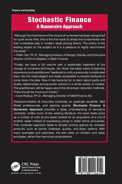 Unlike much of the existing literature, Stochastic Finance: A Numeraire Approach treats price as a number of units of one asset needed for an acquisition of a unit of another asset instead of expressing prices in dollar terms exclusively. This numeraire approach leads to simpler pricing options for complex products, such as barrier, lookback, quanto, and Asian options. Most of the ideas presented rely on intuition and basic principles, rather than technical computations. The first chapter of the book introduces basic concepts of finance, including price, no arbitrage, portfolio, financial contracts, the First Fundamental Theorem of Asset Pricing, and the change of numeraire formula. Subsequent chapters apply these general principles to three kinds of models: binomial, diffusion, and jump models. The author uses the binomial model to illustrate the relativity of the reference asset. In continuous time, he covers both diffusion and jump models in the evolution of price processes. The book also describes term structure models and numerous options, including European, barrier, lookback, quanto, American, and Asian. Classroom-tested at Columbia University to graduate students, Wall Street professionals, and aspiring quants, this text provides a deep understanding of derivative contracts. It will help a variety of readers from the dynamic world of finance, from practitioners who want to expand their knowledge of stochastic finance, to students who want to succeed as professionals in the field, to academics who want to explore relatively advanced techniques of the numeraire change.
