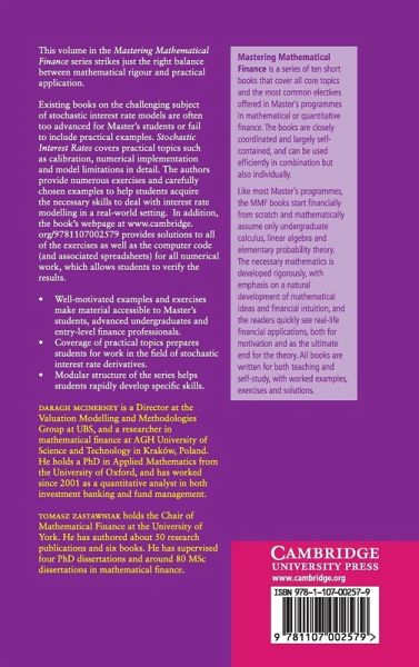 This volume in the Mastering Mathematical Finance series strikes just the right balance between mathematical rigour and practical application. Existing books on the challenging subject of stochastic interest rate models are often too advanced for Master's students or fail to include practical examples. Stochastic Interest Rates covers practical topics such as calibration, numerical implementation and model limitations in detail. The authors provide numerous exercises and carefully chosen examples to help students acquire the necessary skills to deal with interest rate modelling in a real-world setting. In addition, the book's webpage at www.cambridge.org/9781107002579 provides solutions to all of the exercises as well as the computer code (and associated spreadsheets) for all numerical work, which allows students to verify the results.