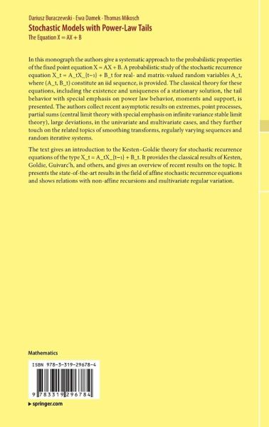 In this monograph the authors give a systematic approach to the probabilistic properties of the fixed point equation X=AX+B. A probabilistic study of the stochastic recurrence equation X_t=A_tX_{t-1}+B_t for real- and matrix-valued random variables A_t, where (A_t,B_t) constitute an iid sequence, is provided. The classical theory for these equations, including the existence and uniqueness of a stationary solution, the tail behavior with special emphasis on power law behavior, moments and support, is presented. The authors collect recent asymptotic results on extremes, point processes, partial sums (central limit theory with special emphasis on infinite variance stable limit theory), large deviations, in the univariate and multivariate cases, and they further touch on the related topics of smoothing transforms, regularly varying sequences and random iterative systems.