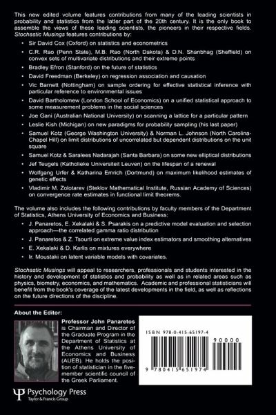 This new edited volume features contributions from many of the leading scientists in probability and statistics from the latter part of the 20th century. It is the only book to assemble the views of these leading scientists--the pioneers in their respective fields. Stochastic Musings features contributions by: *Sir David Cox on statistics and econometrics; *C.R. Rao, M.B. Rao, and D.N. Shanbhag on convex sets of multivariate distributions and their extreme points; *Bradley Efron on the future of statistics; *David Freedman on regression association and causation; *Vic Barnett on sample ordering for effective statistical inference with particular reference to environmental issues; *David Bartholomew on a unified statistical approach to some measurement problems in the social sciences; *Joe Gani on scanning a lattice for a particular pattern; *Leslie Kish on new paradigms for probability sampling (his last paper); *Samuel Kotz and Norman L. Johnson on limit distributions of uncorrelated but dependent distributions on the unit square; *Samuel Kotz and Saralees Nadarajah on some new elliptical distributions; *Jef Teugels on the life span of a renewal; *Wolfgang Urfer and Katharina Emrich on maximum likelihood estimates of genetic effects; and **Vladimir M. Zolotarev on convergence rate estimates in functional limit theorems. The volume also includes the following contributions by faculty members of the Department of Statistics, Athens University of Economics and Business: *J. Panaretos, E. Xekalaki, and S. Psarakis on a predictive model evaluation and selection approach--the correlated gamma ratio distribution; *J. Panaretos and Z. Tsourti on extreme value index estimators and smoothing alternatives; *E. Xekalaki and D. Karlis on mixtures everywhere; and * Ir. Moustaki on latent variable models with covariates. Stochastic Musings will appeal to researchers, professionals, and students interested in the history and development of statistics and probability as well as in related areas, such as physics, biometry, economics, and mathematics. Academic and professional statisticians will benefit from the book's coverage of the latest developments in the field, as well as reflections on the future directions of the discipline.