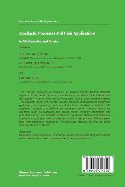 Stochastic stability for vector fields with a manifold of singular points, and an application to lattice gauge theory.- Ricci curvature and dimension for diffusion semigroups.- The Zitterbewegung of a Dirac electron in a central field.- Maximum entropy principles for Markov processes.- An optimal Carleman-type inequality for the Dirac operator.- Toeplitz operators - an asymptotic quantization of symplectic cones.- Perturbation theory for random disordered systems.- On rigorous hydrodynamics, self-diffusion and the Green-Kubo formulae.- A stochastic model for plasma dynamics.- Macroscopic potentials of dissipative dynamical systems.- Random-path intersections in geometry, probability and physics.- Noncummutative version of the central limit theorem and of Cramér's theorem.- Distributions, Sobolev spaces on Gaussian vector spaces and Ito's calculus.- On problems in stochastic differential equations connected with some particular type of interacting particles.- Asymptotic behaviors of moments for one-dimensional generalized diffusion processes.- Langevin equation and fluctuation-dissipation theorem.- The Dirichlet problem for quasi-linear partial differential operators with boundary data given by a distribution.- Stationary stochastic perturbation of a linear delay equation.- Random lattice models.- Interactions galileennes aimant-charge.- The polaron functional integral.- The Bosonic string.