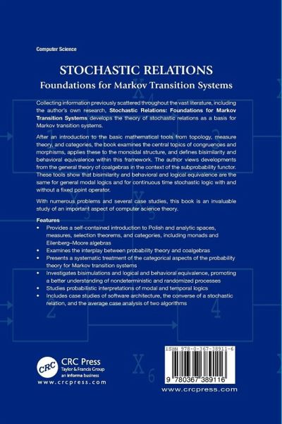 This book develops the theory of stochastic relations as a basis for Markov transition systems. After an introduction to the basic mathematical tools from topology, measure theory, and categories, it examines congruences and morphisms. It applies these topics to the monoidal structure, and defines bisimilarity and behavioral equivalence within this framework. Developments from the general theory of coalgebras in the context of the subprobability functor are presented. The book also includes case studies of software architecture, the converse of a stochastic relation, and the average case analysis of two algorithms.