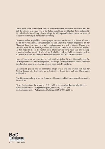 Dieses Buch stellt Material vor, das der Autor für seinen Unterricht erarbeitet hat, das sich dort, in der Lehreraus- wie in der Lehrerfortbildung bewährt hat. Es ist gedacht für die individuelle Fortbildung, als Grundlage für Bildungsmaßnahmen sowie als Material in Lehrveranstaltungen der Lehrerausbildung. Die ersten sieben Kapitel bieten Anregungen zum Stochastikunterricht in den Klassen 5 bis 10 des Gymnasiums, Fortsetzungen für die Oberstufe werden angeboten. In der Oberstufe kann im Unterricht auf grundlegendem wie auf erhöhtem Niveau eine sinnvolle Auswahl aus den vorgestellten Inhalten der Kapitel 8 bis 10 behandelt werden. In den Kapiteln 11 bis 13 werden zwei Themenkreise vorgestellt, die anwendungsorientiert Brücken von der Stochastik zu den beiden anderen Gebieten der Oberstufen-Mathematik bauen, und interessante weiterführende Ein- und Ausblicke bieten. In den Kapiteln 14 bis 16 werden motivierende Aufgaben für den Unterricht und für Leistungskontrollen zusammengestellt. Wichtige Lösungselemente sowie Hinweise zum Erstellen anspruchsvoller Aufgaben ergänzen die Darstellung. In Kapitel 17 geht es um die spannende Frage, wann, wie und warum sich aus der Algebra heraus die Stochastik als selbständiges Gebiet innerhalb der Mathematik etabliert hat. Eine Zitatensammlung sowie ein Literatur-, Namens- und Stichwortverzeichnis runden das Buch ab.Dieses Buch umfasst die beiden bei BoD erschienenen Stochastikunterricht-Bücher :Stochastikunterricht - Aufgabenbeispiele, ISBN 978 3 743 188 402Stochastikunterricht - Aufgaben und Anfänge, ISBN 978 3 741 288 616