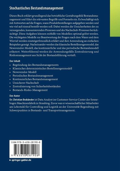 Dieses Buch erklärt grundlegend das betriebliche Gestaltungsfeld Bestandsmanagement und führt die relevanten Begriffe und Formeln ein. Es beschäftigt sich mit Antworten auf die Fragen, wann Produktbestellungen aufgegeben werden und wie viel auf einmal bestellt werden soll. Dabei werden die Unsicherheiten des zu versorgenden, konsumierenden Prozesses und des Nachschub-Prozesses berücksichtigt. Diese Aufgaben können mithilfe von Modellen optimal gelöst werden. Die wichtigsten Modelle zur Beantwortung der Fragen nach dem Wann und dem Wieviel werden einsteigerfreundlich erklärt und ihre Anwendung an einfachen Beispielen gezeigt. Nacheinander werden das klassische Bestellmengenmodel, das Newsvendor-Modell, das kontinuierliche und das periodische Bestandsmodell erläutert. Weiterführend werden die Anwendungsfälle Zentralisierung und Risikomanagement aus Sicht der Bestandsführung vertieft.